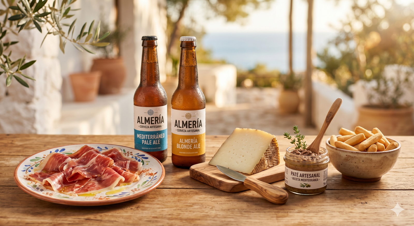 Una selección gourmet sencilla, fresca y muy fácil de disfrutar: jamón duroc, queso semicurado, paté, colines y 2 cervezas artesanas de Almería. Ideal para una parada cómoda con sabor local.